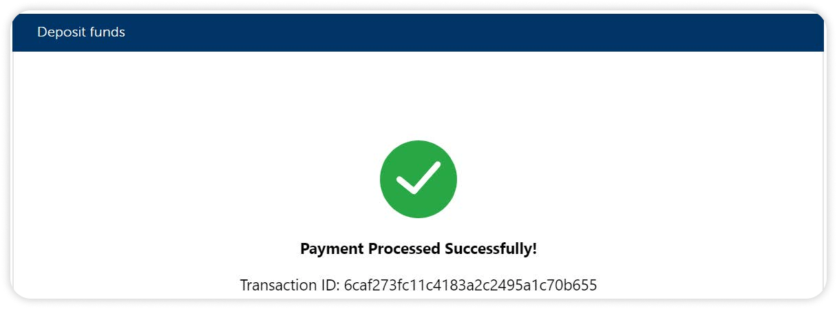 When prompted, please enter your bank one-time PIN or approve your bank’s in-app approval message to authorise the card transaction. The status of your payment will be displayed on-screen as shown below. If successful, your Sunbet account will be credited immediately. / 出现提示时,请输入您的银行一次性 PIN 或批准银行的应用程序内批准消息以授权卡交易。您的付款状态将显示在屏幕上,如下所示。如果成功,您的 Sunbet 帐户将立即记入账户。