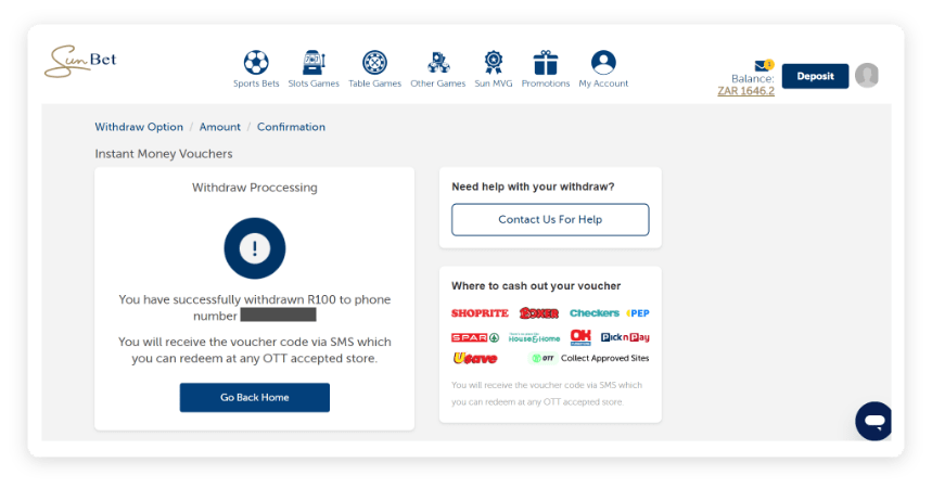 You will receive an SMS with a voucher number and pin to use to withdraw your money